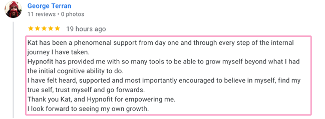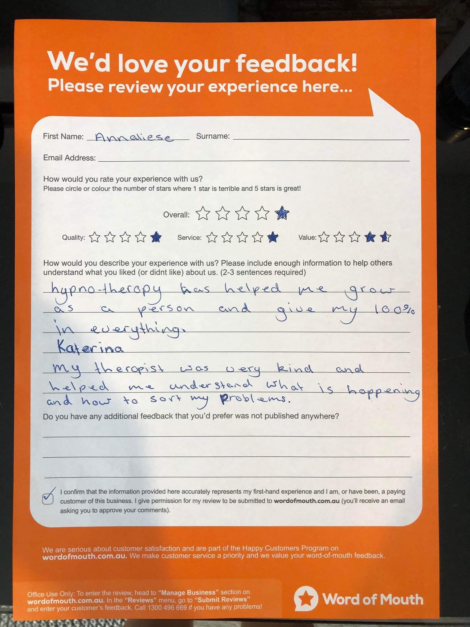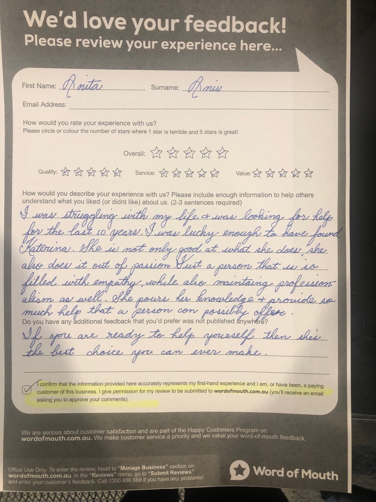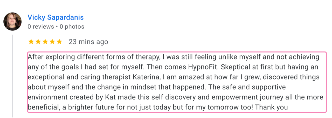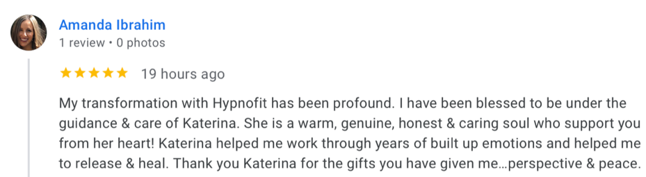 Through the power of hypnosis, she was able to heal and overcome her low self-worth and anxiety, ultimately embodying self-love. This transformation led to a successful, meaningful career and, for the first time, a loving and committed relationship. Inspired by her own journey, Katerina decided to train as a hypnotherapist to help others achieve similar results.