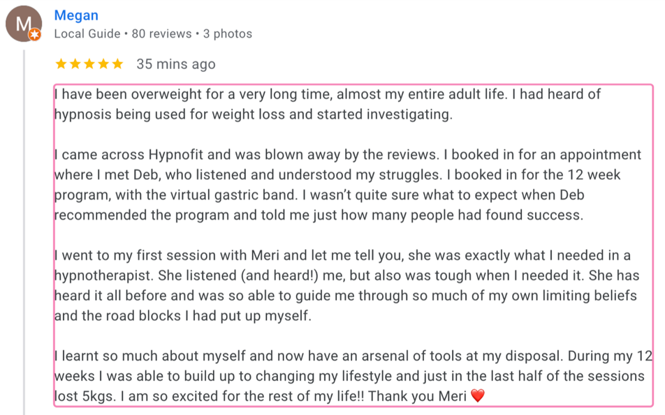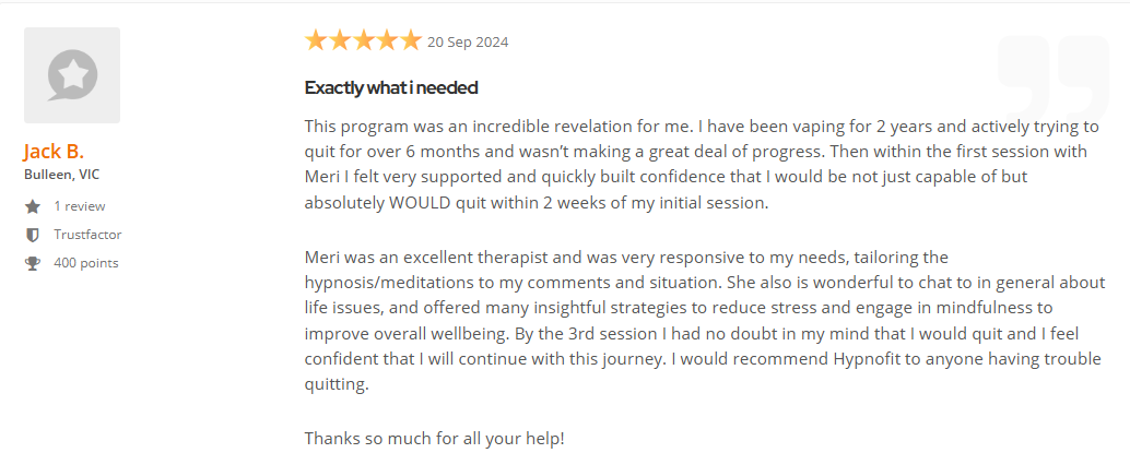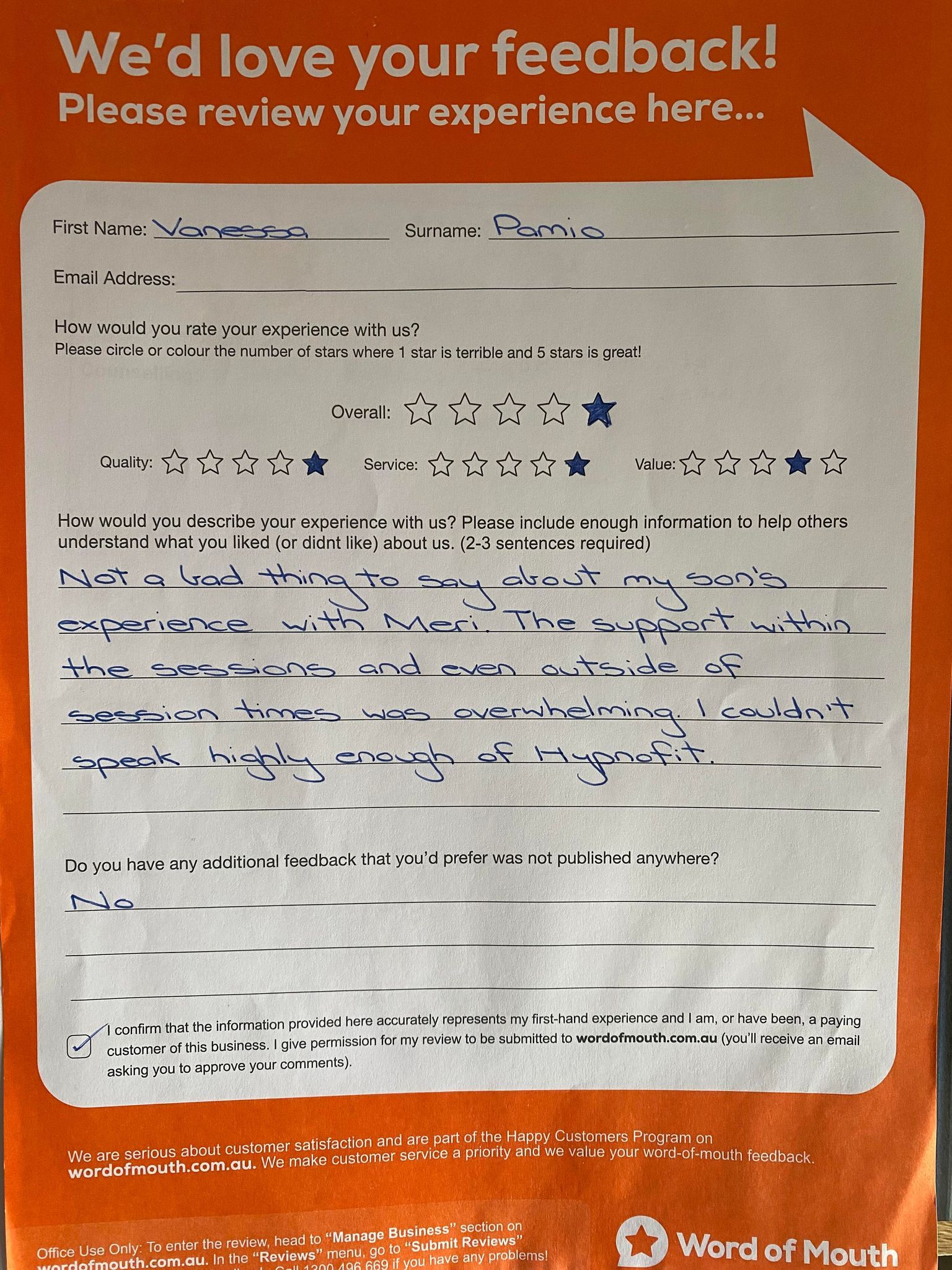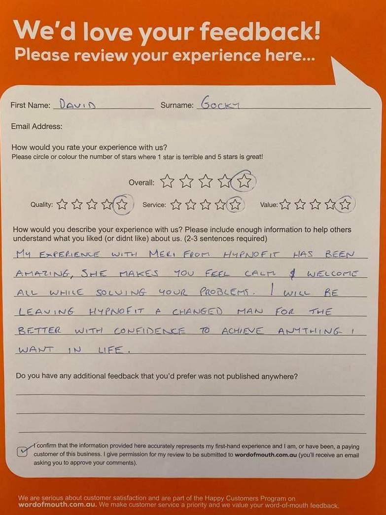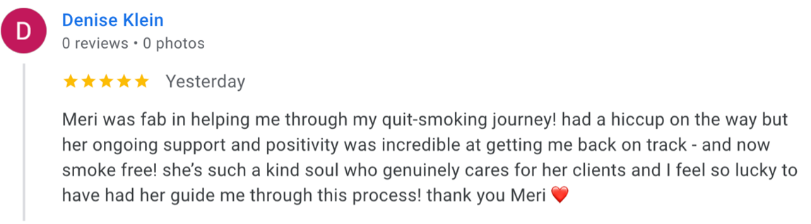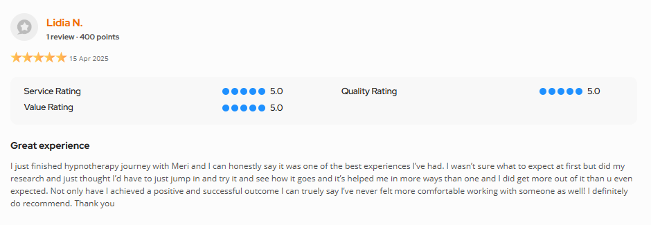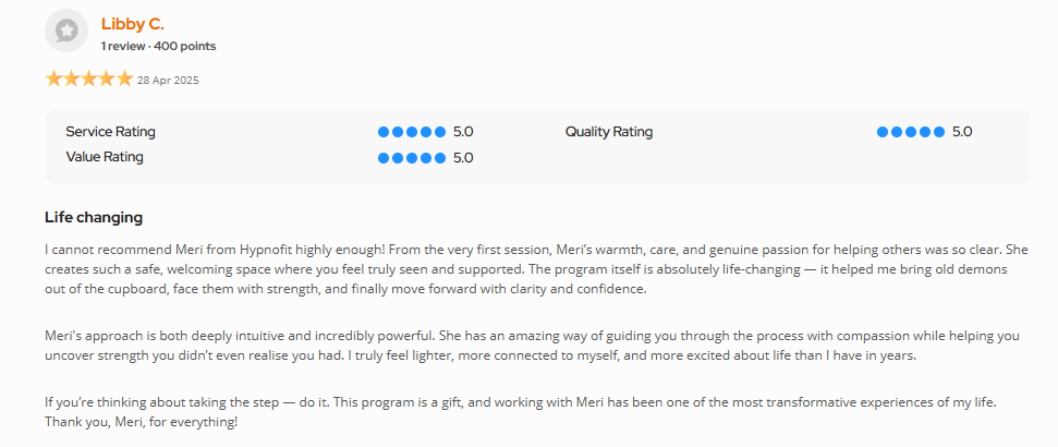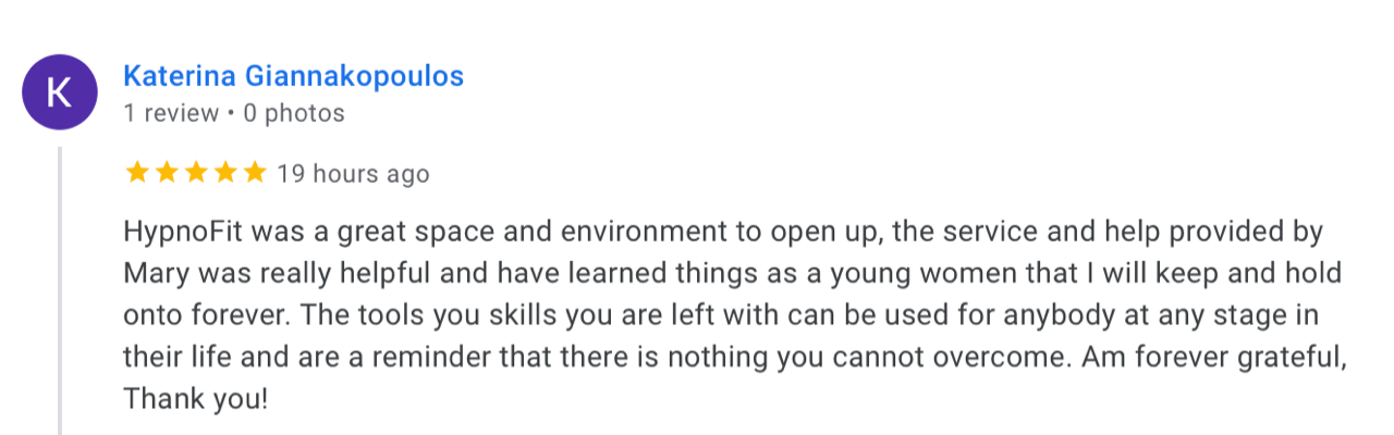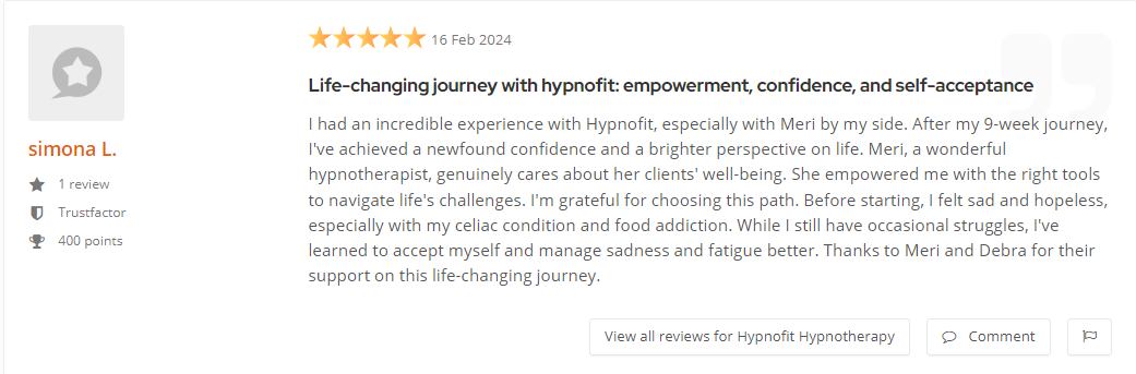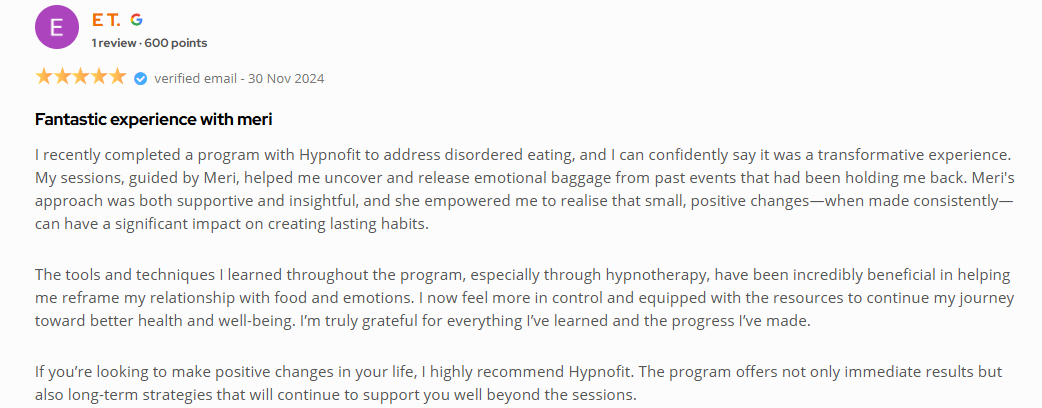 Fourteen years ago, Meri was a client at Hypnofit, an experience that fueled her drive to become a Hypnotherapist and assist others in overcoming their struggles.